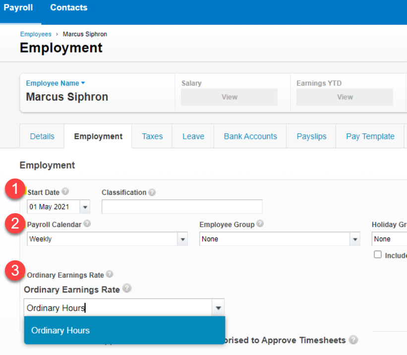1. Set The employee start date (this should be before their first pay run2. Assign a pay calendar to the employee.