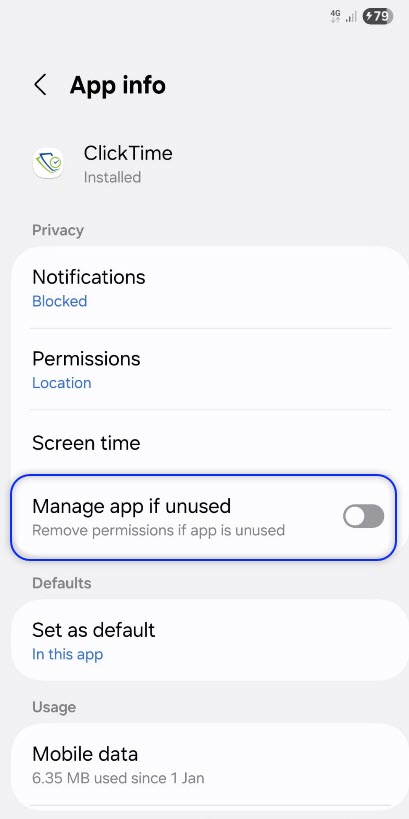 Android includes an “Unused App Management” feature that may pause apps that haven’t been opened for a while. When this happens, the system can revoke permissions and stop background activity, which may prevent ClickTime from performing Auto Clock‑In/Out reliably.